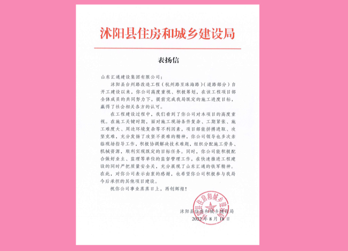 近日,沭陽縣住房和城鄉建設局向匯通公司發來表揚信,對沭陽縣臺州路改造工程項目部面對工期緊、管線障礙多、周邊環境復雜等不利因素,科學調度周密組織,嚴把工程質量安全關,提前完成進度目標給予高度肯定。