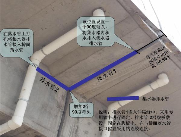 為有效排除伸縮縫內(nèi)積水及避免伸縮縫位置滲漏對橋梁、墩柱外觀及實體質(zhì)量的影響,二環(huán)南路四標項目部在公司總工辦指導(dǎo)下,進行伸縮縫集水器排水管安裝。